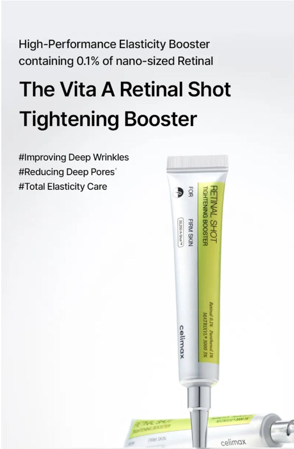 Celimax The Vita-A Retinal Shot Tightening Booster 15ml is a powerful nighttime anti-aging treatment formulated with 0.1% retinal and 3% Matrixyl 3000 to visibly reduce wrinkles, tighten pores, and improve skin elasticity while enhancing overall radiance. Using A-Shot™ micro-particle delivery technology, it delivers active ingredients deep into the skin for maximum absorption with minimal irritation. The formula includes niacinamide to brighten and refine texture, 1% panthenol to soothe and hydrate, and antioxidants like vitamin E and vitamin C to protect and promote a healthier, more youthful complexion. Key ingredients include retinal, Matrixyl 3000 peptides, niacinamide, panthenol, tocopherol, ascorbic acid, and hydrating emollients.
